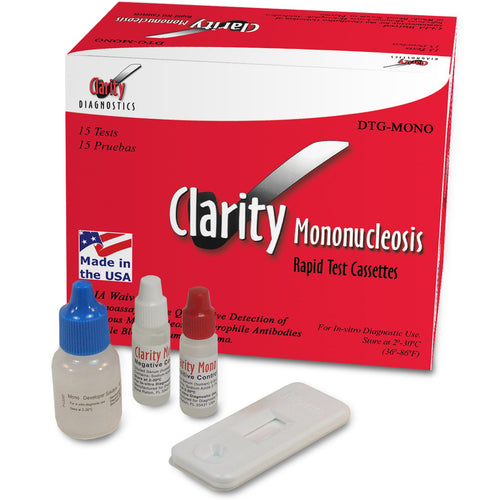 The Clarity Diagnostics Clarity Mononucleosis Test Rapid Test Cassette (#DTG-MONO / 15 per Box) (#DTG-MONO / 15 per Box) includes 15 test cassettes, a developer solution, 15 sample transfer tubes, a positive control, a negative control, a package insert, and a procedure card.