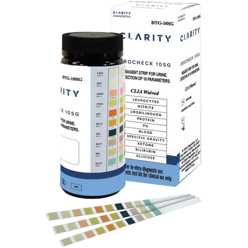 The Clarity Diagnostics Clarity Urocheck 10SG - 10 Parameter Urine Test Strip (#DTG-10SG / 100 per Box) can be used for visual and analyzer reading using only the Clarity UroCheck 120 and 120C analyzers.