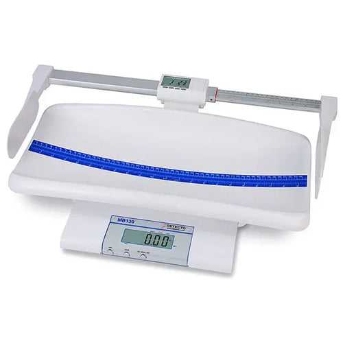 The Detecto Digital Convertible Pediatric Scale (#MB130) includes a removable tray, integral analog measuring tape, and an AC adapter.