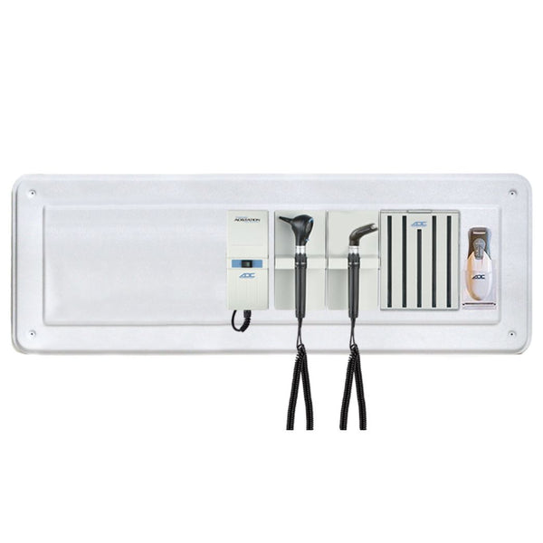 The ADC Adstation 5611-36 3.5V Wall Otoscope/Throat Illuminator Diagnostic Set with Wallboard for ADView 2 includes a Diagnostix 5420 3.5V Otoscope Head, Diagnostix 5426 3.5V Throat Illuminator Head, power supply base unit that includes a power switch, two 3.5V handles, extension module, 5630 Wall Specula Dispenser, and an Adstation Wallboard that allows you to easily mount your diagnostic set while leaving enough space to add and install an ADC ADView 2 Modular Diagnostic Station.