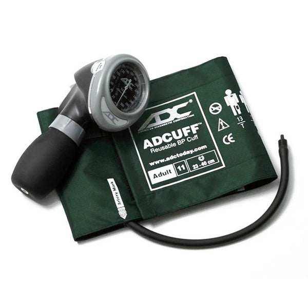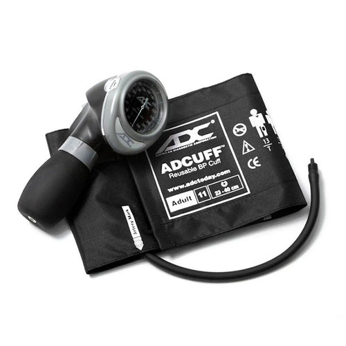 The ADC Diagnostix 703 Palm Aneroid Sphygmomanometer - Adult includes a revolutionary palm style manometer, an Adcuff Nylon Cuff, and a leatherette carrying case with a self repairing nylon zipper.