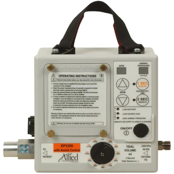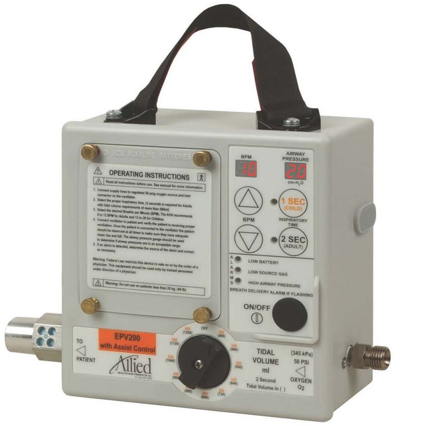 - Settings visible on the unit include inspiratory time, tidal volume, BPM controls, digital manometer, along with visual and audible safety alarms