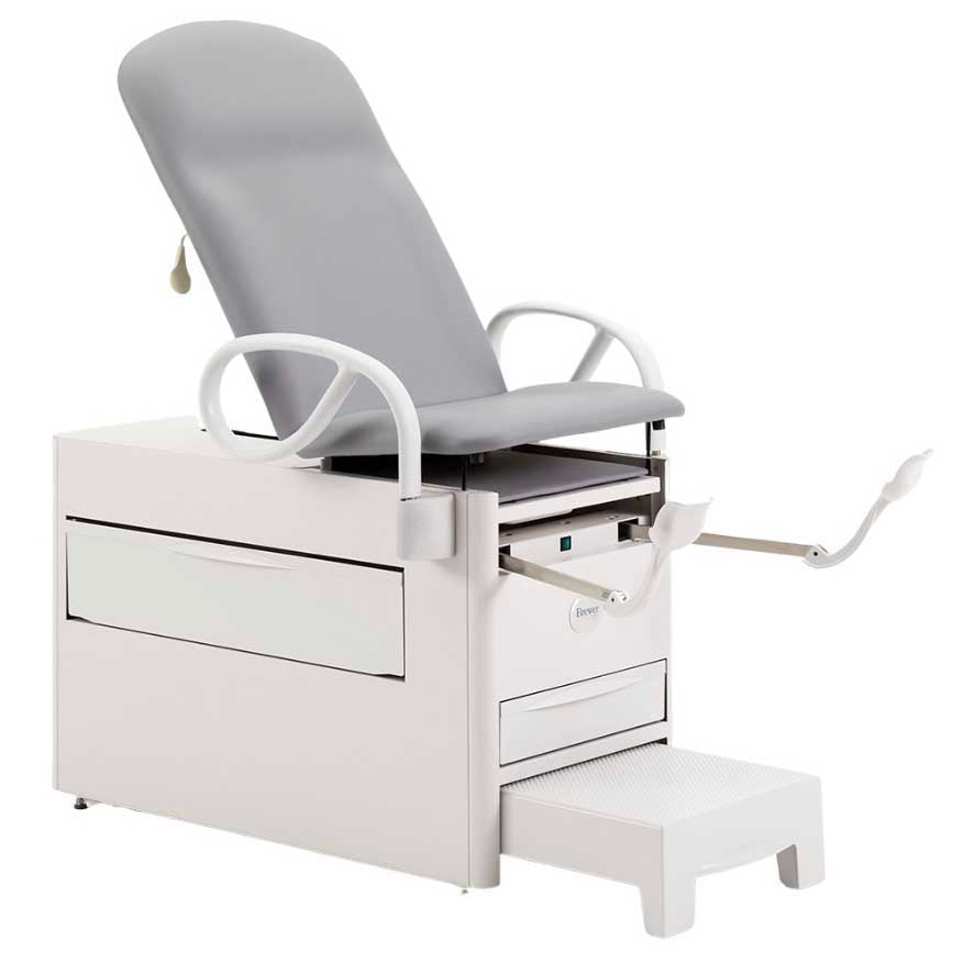 The Brewer Versa Exam Table with Patient Assist Handles, Stirrups, Pelvic Tilt, Electrical Receptacle, and Drawer Warmer includes pass-through rear drawer, upholstered top, and pneumatic/manual back.