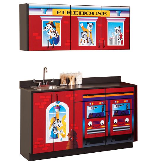The Clinton Firehouse Cabinets (#6130-BW) include a set of base and wall cabinets all adorned with Clinton original illustrations.