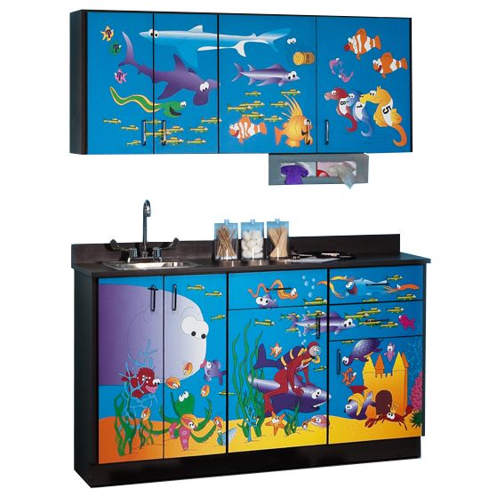 The Clinton Ocean Commotion Cabinets (#6136-BW) include a set of base and wall cabinets all adorned with Clinton original illustrations.