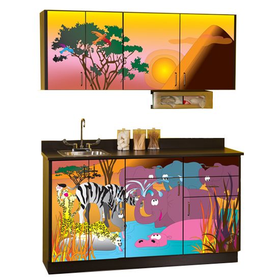 The Clinton Serengeti Sunrise Cabinets (#6151-BW) include a set of base and wall cabinets all adorned with Clinton original illustrations.