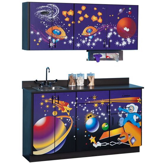 The Clinton Space Place Cabinets (#6135-BW) include a set of base and wall cabinets all adorned with Clinton original illustrations.