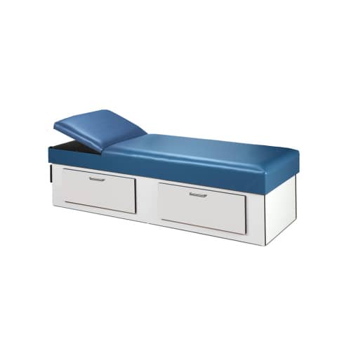 The Clinton Upholstered Apron Couch with Double Drawer Storage and Flat Foam Adjustable Headrest (#3713-15) is perfectly suited for an exam room or a patient in recovery. This sturdy couch is comstructed from easy-to-clean laminate and features heavyweight, knitbacked upholstery and 2" of firm foam padding. It also boasts a 300 lb load capacity under normal use.