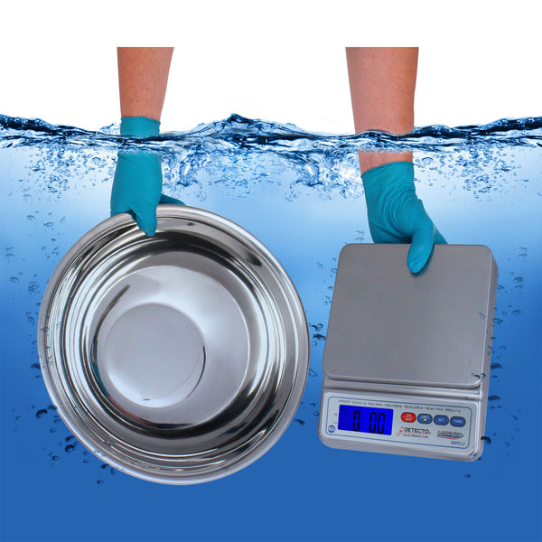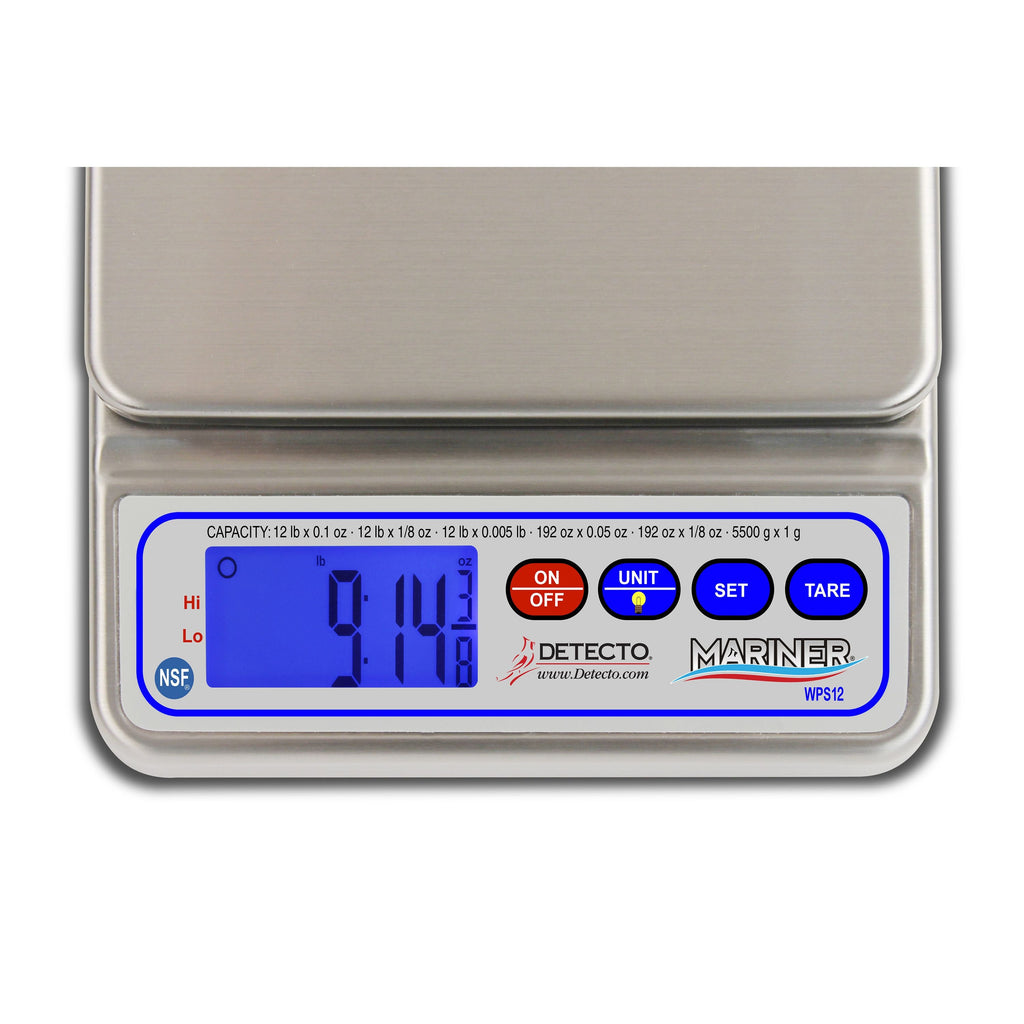 - Underpad/Wet Diaper Scale, Mariner Waterproof IP67, 12-lb capacity, Underpad Bowl, Stainless Steel, Raised Buttons, Tare Button, 1.2in High Backlit Blue LCD, AC Adapter and Battery Included, 13.6in(W)x13.6in(D)x6.9in(H)