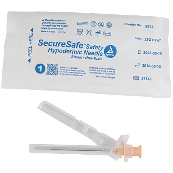 - SecureSafe safety mechanism features a quick cover that enables the user to cover and protect the needle with a press and snap