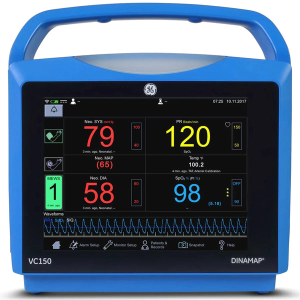 The GE CARESCAPE VC150 Vital Signs Monitor sends accurate patient data directly and wirelessly to your EMR system. Its configurable monitor can be used for spot-checking or for continuous monitoring, providing you the flexibility of two devices in one.