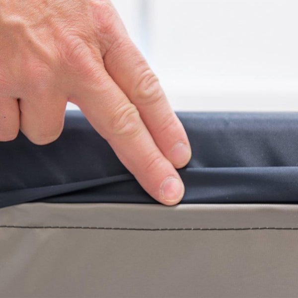 The removable cover is made of a Nymed polyurethane coated healthcare nylon top, 210 Denier (soft-never brittle), and Vynmed healthcare polyurethane coated vinyl bottom. It is fluid proof, anti-fungal, and stain resistant. The heavy-duty zipper has a fluid protection flap designed to direct fluid over and away from the zipper area.