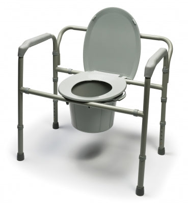 Versatile 3-in-1 design can be used as a bedside commode, raised toilet seat or toilet safety frame Welded steel construction provides strength and stability Folds flat for convenient storage and travel (to less than 7") Tool-free assembly Sturdy plastic seat snaps-on easily Comes complete with commode pail, cover and splash shield Designed to meet the requirements of HCPCS code: E0168 Maximum Weight Capacity 650 lb - EVENLY DISTRIBUTED Limited lifetime warranty