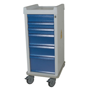 The Harloff MRN6K is a narrow six-drawer Anesthesia Car with a key lock, 2 keys, low-ferrous, ball-bearing full extension drawer slides, low-ferrous 5" sealed, ball-bearing casters (full swivel; one with brake, one directional), stainless steel pull-out shelf, and a replaceable plastic top with integrated push handles.