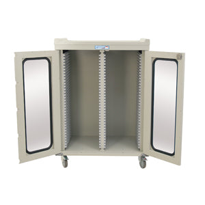 The MS6140DR is a _ height double column medical storage cart with key locking tempered glass double doors, designed for quick access to medical instruments and supplies, featuring the most innovative modular tray system on the market. At just under five feet tall, the MS6140DR is 50 pounds lighter and 18 inches shorter than the MS8140DR. The MS6140DR can be configured for use in Arthroscopy, Cardiology, Catheterization, Cystoscopy, Endovascular Labs, ENT, Interventional Radiology, Laparoscopy, Ophthalmology, Orthopedic, Neurology, Urology and Vascular.