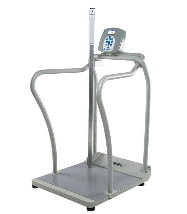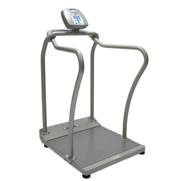- Live handrails allow patient to hold on for stability while scale accurately calculates weight