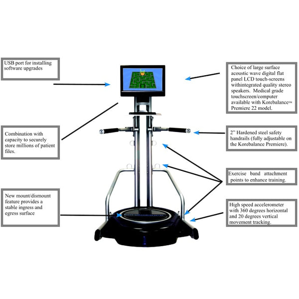 Cognitive: The Korebalance Premier features optional cognition baseline and training module software. The testing and training session can include both balance and cognition, cognition only, or balance only. Test results can be stored and compared to assess mental decline and mTBI improvement and regression. Applications include fall reduction screening and rehabilitation, orthopedic rehabilitation, treating of peripheral neuropathies, treatment and assessment of mTBI and cognition, and identification of symptom magnification.
