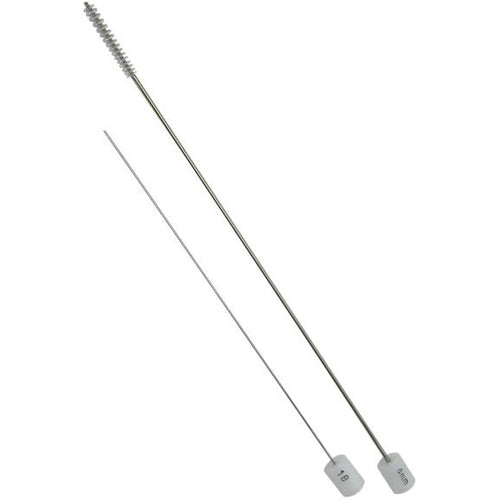 The Medco Autoclavable Cannula Brush is reusable and designed for cleaning cannulas. The bristles are made of nylon, and the extension tube is made of 304 tubing. The handle is made of delrin, and has a 3/8" diameter for easier handling and twisting with fingertips during cleaning.