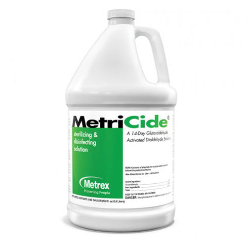 Metrex MetriCide - Gallon (4/Case) (#10-1400) is a cleaning solution for a variety of medical devices, and is reusable for up to 14 days. The MetriCide solution has to stay above the minimum effective concentration (MEC) of glutaraldehyde, which can be checked via chemical indicator with the MetriTest strips.