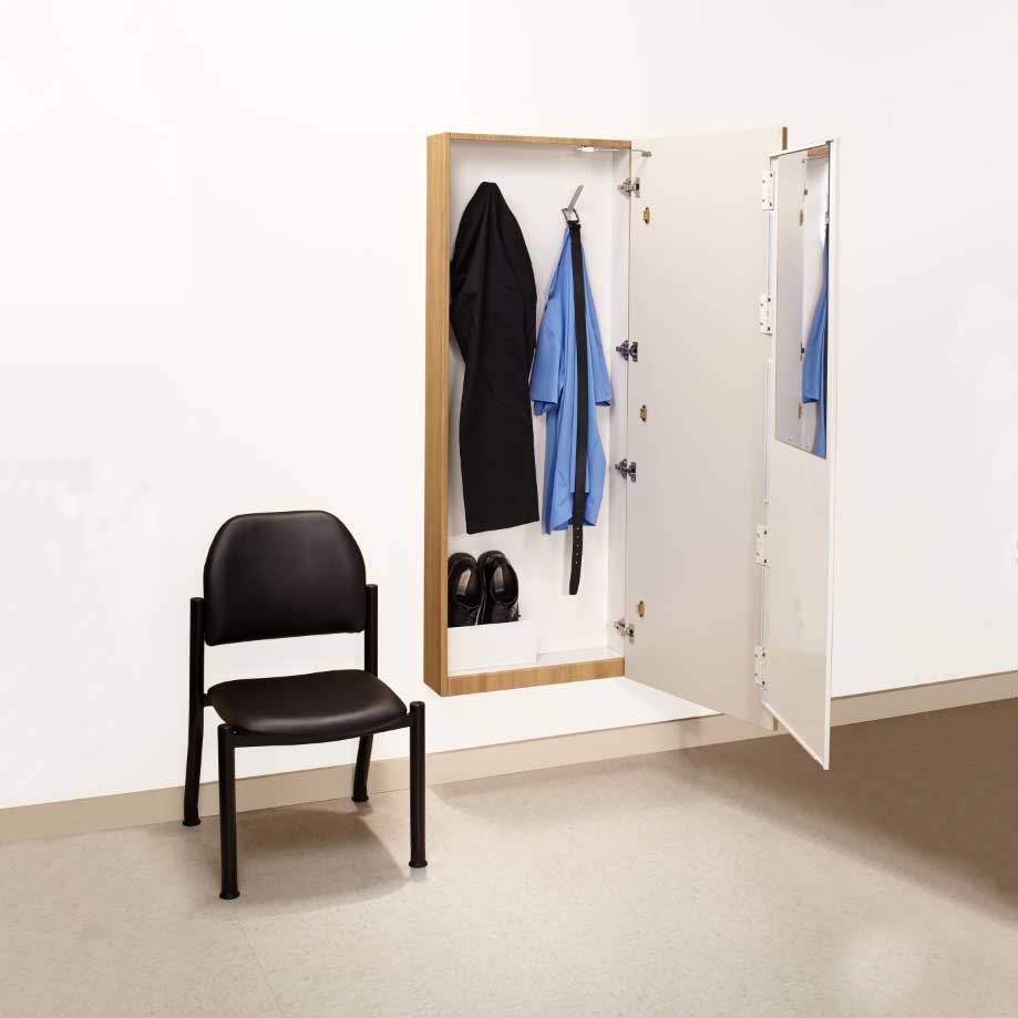 The Midmark Synthesis Dressing Nook with Left Hand Door includes interior mirror, garment hooks, and shoe storage.