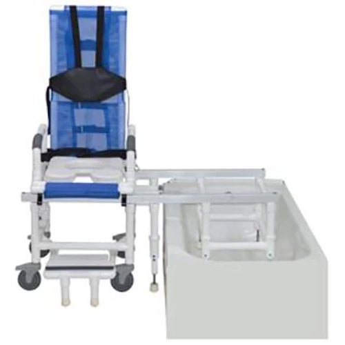 MJM Advantages - Healthcare Grade, Assists Care Givers When Transferring Patients, Will Accommodate 9” Tub Wall (Custom Width Available), Deluxe Elongated Open Front Soft Seat, Dual Drop Arm (Secured With Safety Straps), One Step Locking System Easily Operates With Single Lever Pull Knob And There Is No Risk Of The Chair Frame Coming Off The Track At Any Time. The New Dual Aluminum Rails System Keeps The Chair Rolling Very Secure And Efficient. Safety Belt Increases Safety For Your Resident.