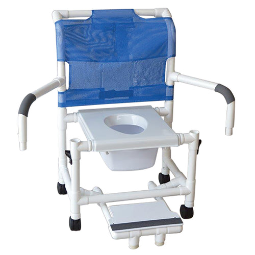 MJM International Shower chair 22" internal width, 3" twin casters w/ full support snap on seat, sliding footrest w/ front supports, double drop arm, 10 qt commde pail, 375 lbs wt cap