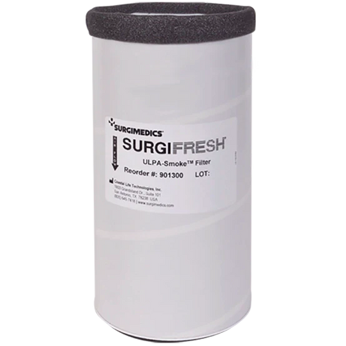 The Surgimedics Surgifresh ULPA Smoke Filter (#901300-000) incorporates VLSI grade-2 ULPA media. It is an economical option for removing particulate, toxic gases, and odor from laser plume or surgical smoke.