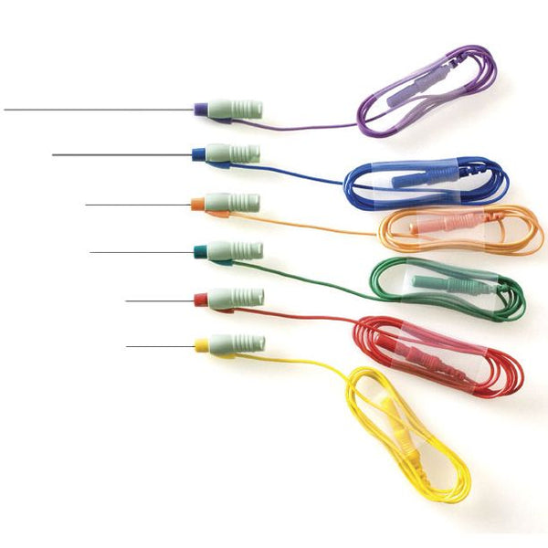 The clear color coding, selected PVC wire length (30" / 0.75 m), and safety DIN 42 802 connector allow easy selection of the right needle for the procedure and comfortable and reliable connection to all EMG equipment.