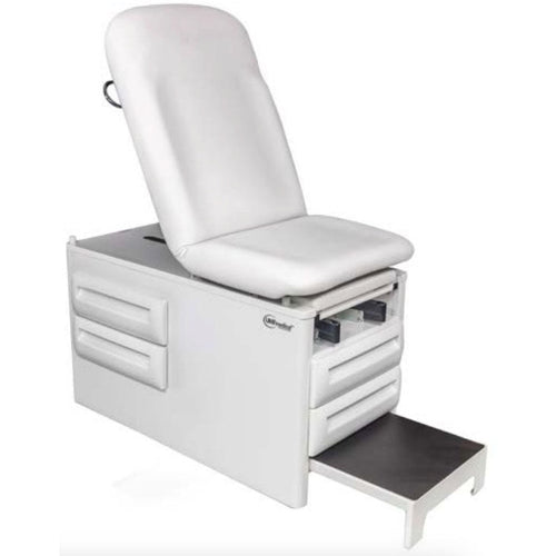The UMF Medical 5240 Manual Exam Table includes 2 large, reversible side storage drawers, 2 large front storage drawers, infinitely adjustable stirrups for all patient sizes, and seamless, removable upholstery with PreFixx protective finish.