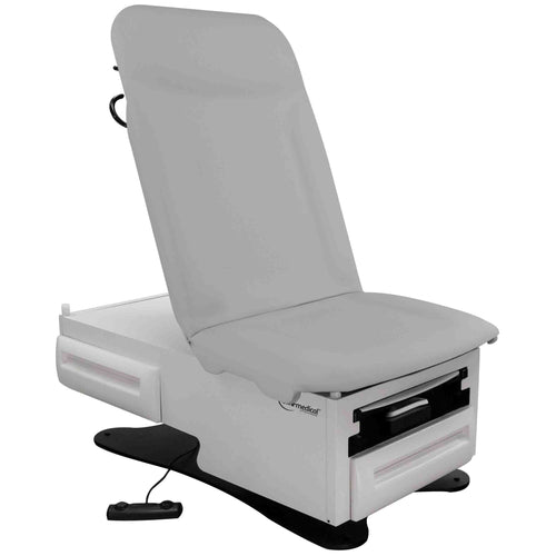 The UMF Medical FusionONE 3001 Power Hi-Lo Exam Table with Premium Upholstery includes Pneumatic Backrest, Foot Control, Front Storage Drawer, and Rear Reversible Storage Drawer.