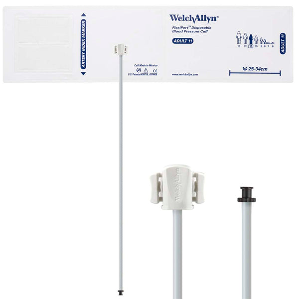 The Welch Allyn FlexiPort Blood Pressure Cuff with One-Tube Tri-Purpose Connector is a convenient and comfortable disposable cuff solution that is designed to simplify the process of measuring blood pressure in a hospital environment.